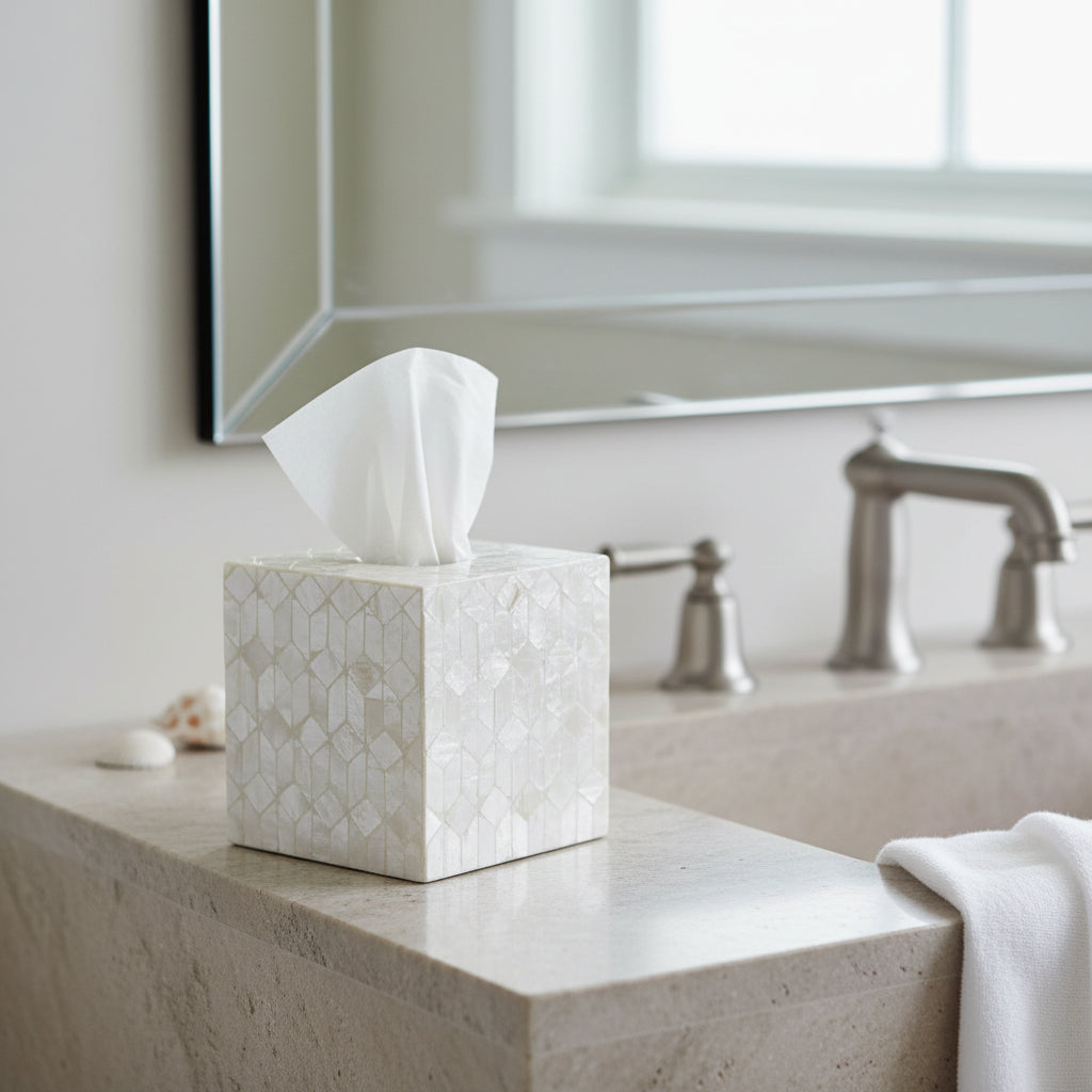 Add a touch of coastal elegance to your space with our Shell Inlay Tissue Box. Crafted with a beautiful blend of creamy whites and delicate shells, this piece effortlessly complements any decor style, from beach inspired rooms to minimalist interiors. It brings a serene, coastal inspired aesthetic to your space while providing a practical touch. A perfect addition for those looking to add a bit of beachy sophistication to everyday essentials. Its refined design makes it a perfect functional accent for your home or office. Cover fits over standard size tissues 14 cm x 15 cm.