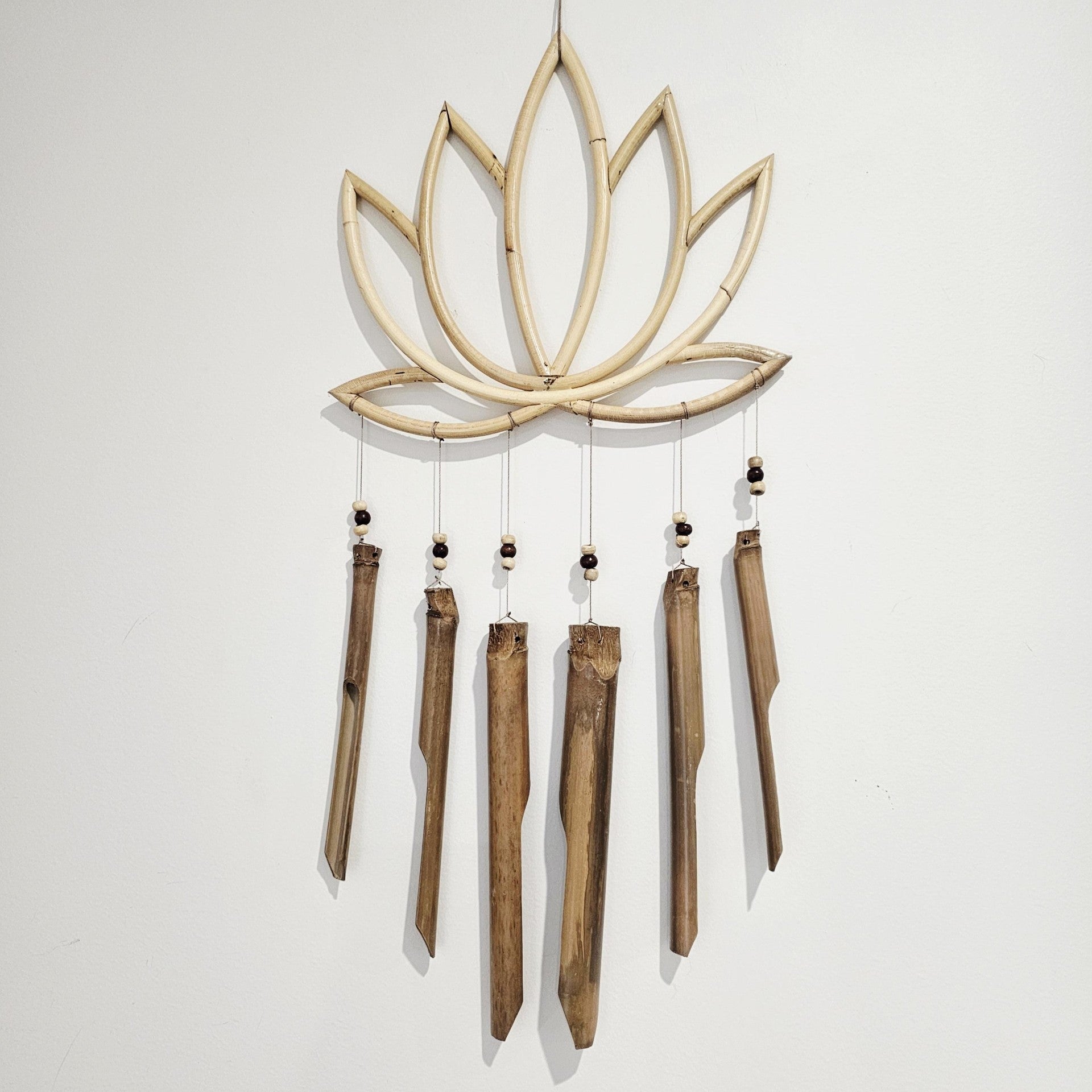Bring a sense of calm and natural beauty to your space with this Lotus Flower Bamboo Wind Chime designed for coastal boho home decor. Crafted from natural bamboo with a delicately shaped lotus flower accent this wind chime creates soft soothing tones that enhance relaxed seaside and bohemian inspired interiors. Its organic materials and gentle movement add visual interest while inviting a peaceful atmosphere indoors or outdoors.