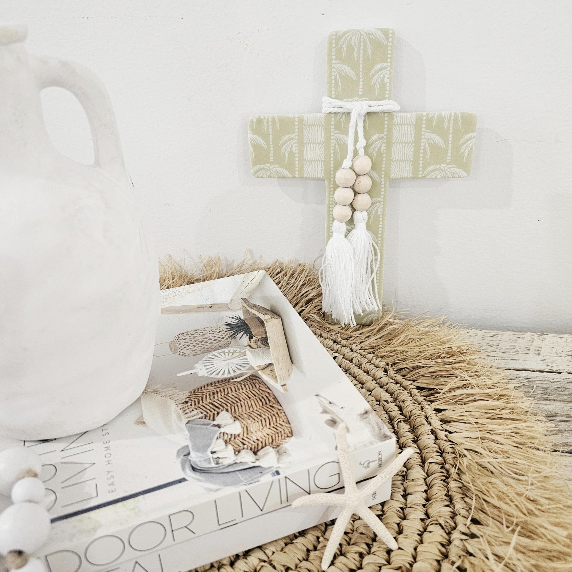 Add a serene and stylish touch to your space with the Oasis Wall Cross. Crafted from durable resin, this cross features a calming sage green finish adorned with a delicate palm tree print that evokes a peaceful, tropical vibe. Accented with a natural wooden bead and a soft white tassel, it brings a handcrafted, boho charm to your decor.