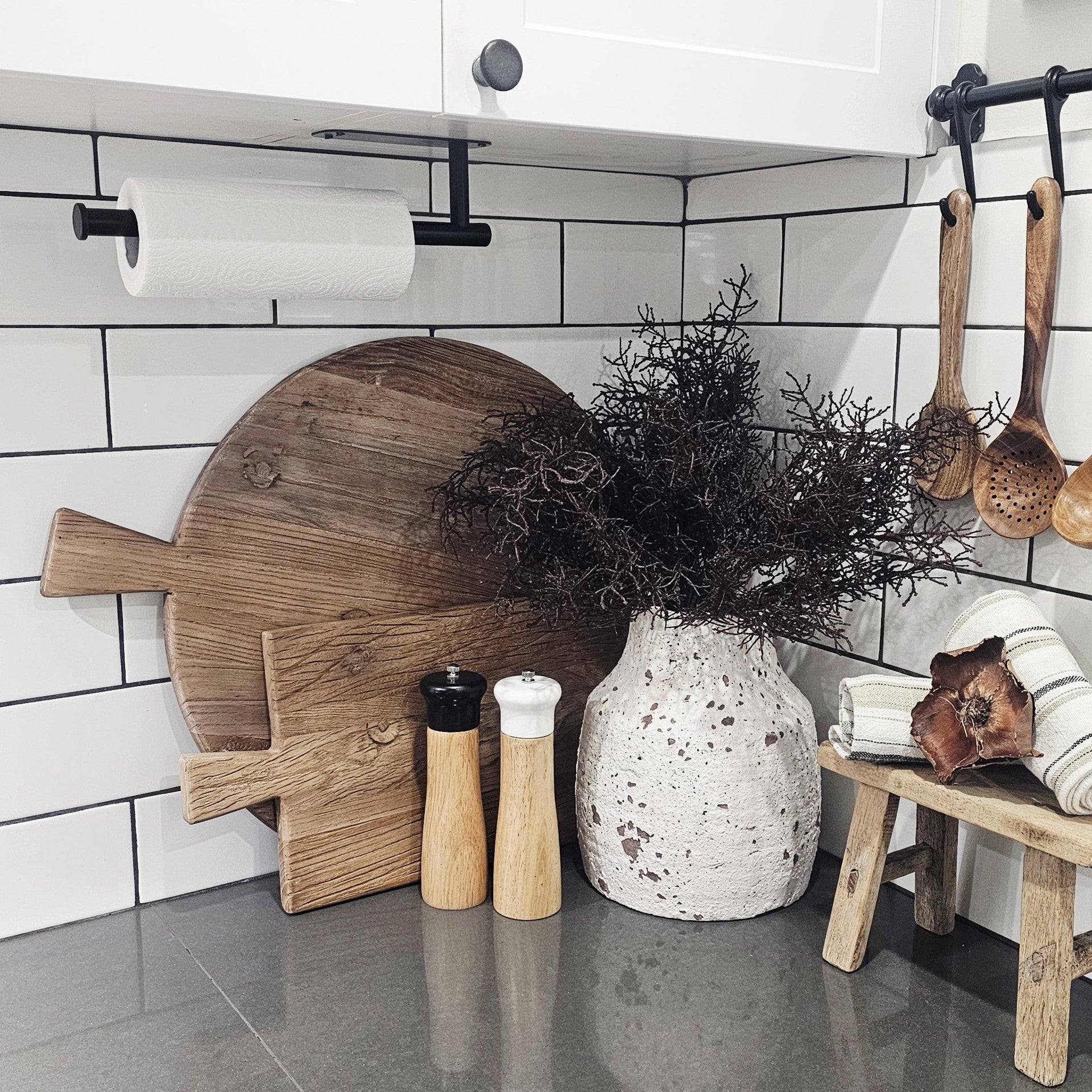 Use it as a functional chopping board, a serving surface for cheeses or small bites, or as a decorative layer under candles, ceramics, or vases. Its raw edges and weathered finish make it a timeless addition to both modern and traditional interiors. Lean it against your backsplash for a casual display or leave it out on the counter to bring natural charm to your space.