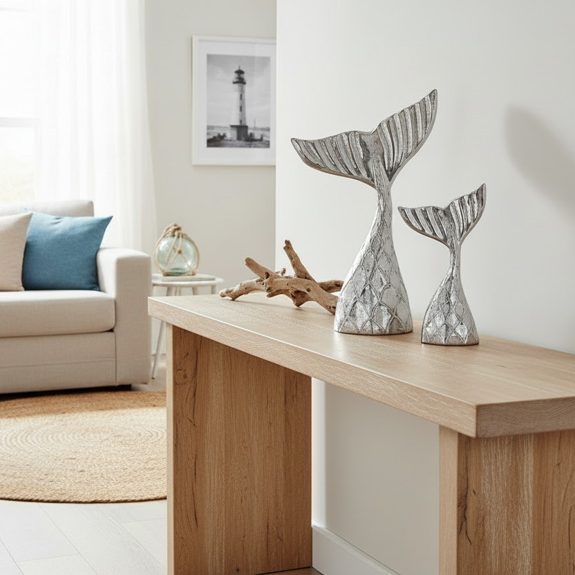 Bring a touch of coastal charm to your space with this beautifully carved Swaying Rustic Mermaid Tails. Handcrafted in Indonesia from natural wood with a whitewash finish adds just the right amount of beachy vibes while letting the natural wood peek through.