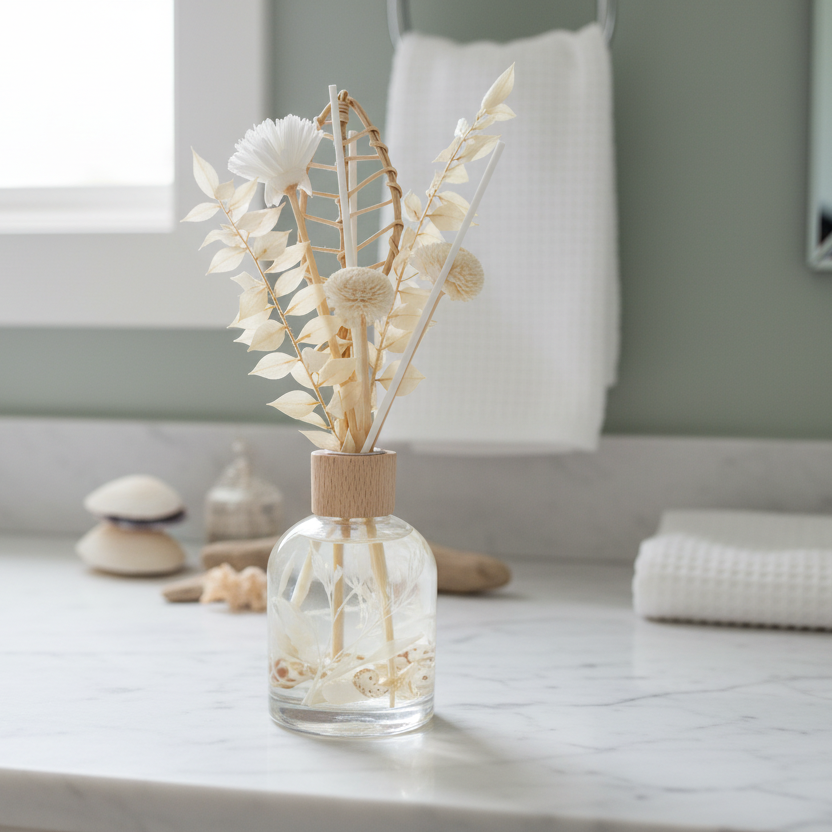 It comes in a clear glass jar to view the botanicals, sea shells and mini star fish inserted inside the diffuser. It has a beechwood collar and is finished with beautiful premium botanical reeds including rattan palm which provides a stunning visual.