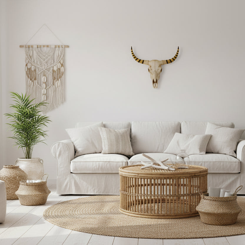 For bedroom styling, position the skull above a bedhead or feature wall combined with soft neutral bedding and textured cushions. This creates a relaxed boho retreat with character and personality.