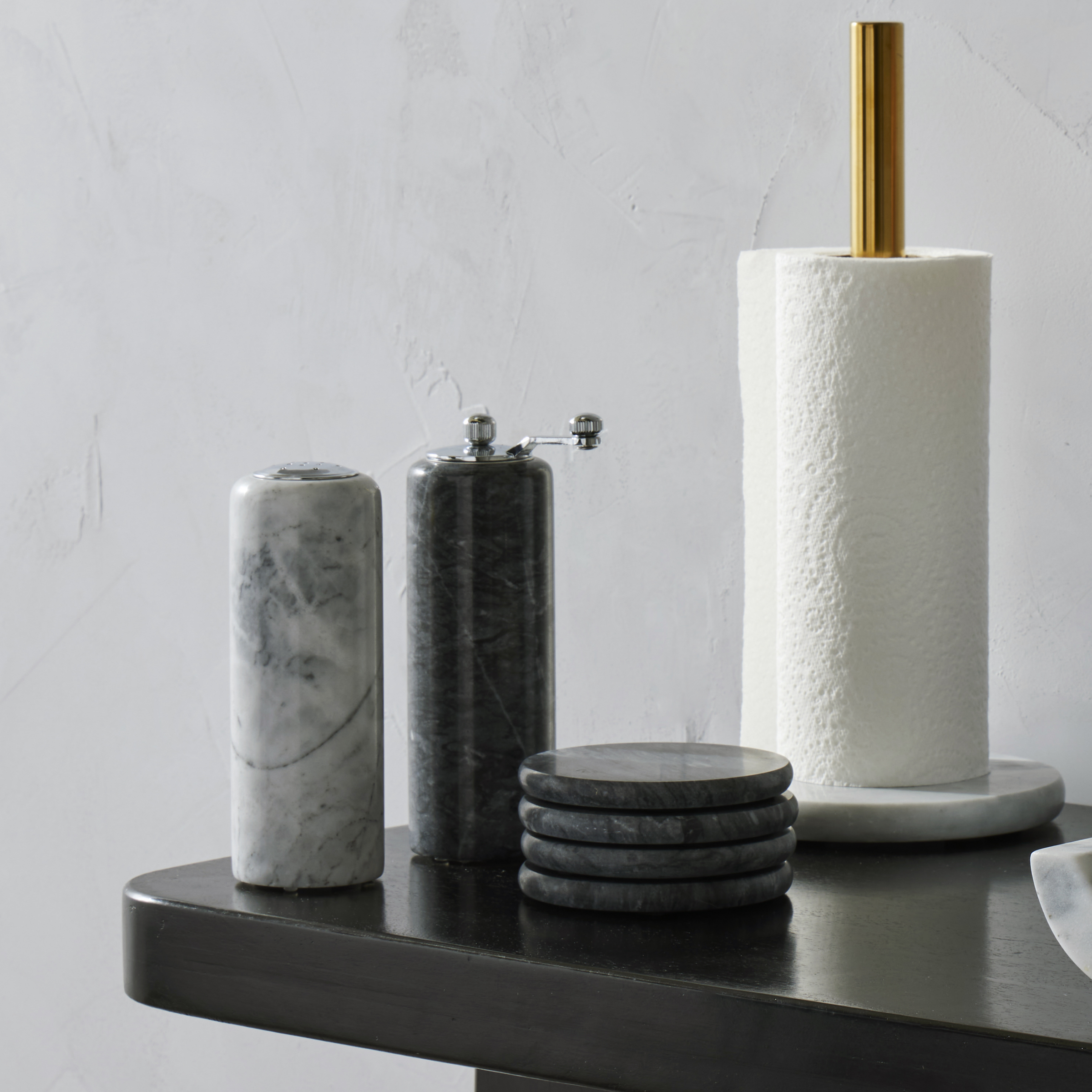 Made from natural marble, each piece showcases unique veining and a luxurious weight that instantly enhances your kitchen or dining decor. This timeless set complements modern coastal classic and contemporary interiors with ease. 15 cm high x 5 cm diametre